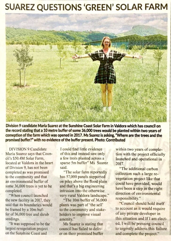 Coolum Advertiser, 20 February 2020. Division 9 candidate Maria Suarez says that Council's $50.4M Solar Farm, located at Valdora in…